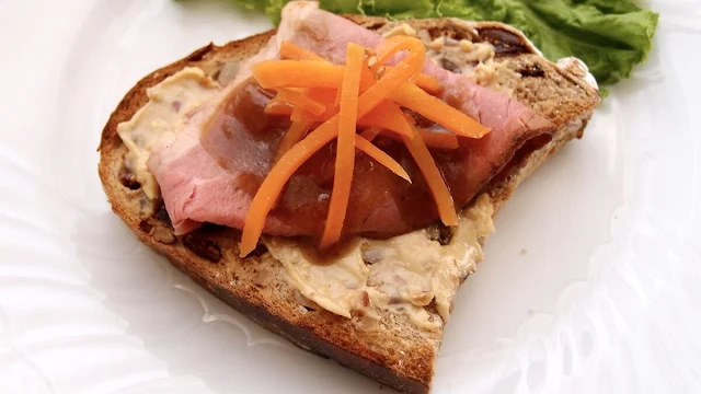 軽くトーストした『フィグウォールナッツブレッド』に載せたのは、『アーモンドバター』と『ローストビーフサラダ&レホールガーリックソース』とごま入りキャロットラペ。一見合わないのでは?と思うかも知れないけれど、めちゃうまでした(笑)。